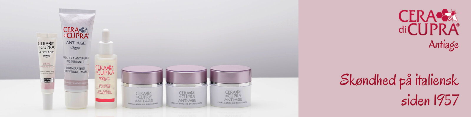 CERA di CUPRA Antiage med præbiotika er en ærlig og prisvenlig hudplejeserie, der holder hvad den lover. Hovedingredienserne i serien er risprotein, sojaprotein, A- og E-vitamin, gær-ekstrakt, mælkeprotein, shea butter, avoca- do-olie, jojoba-olie, hyaluronsyre, kollagen og microalger, som alle er kendt for at beskytte, nære og opstramme huden.